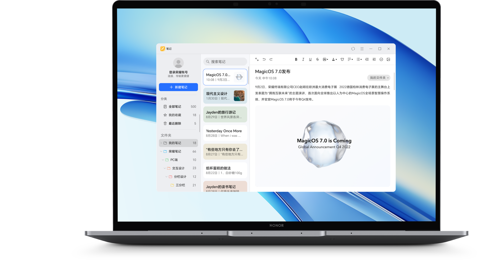 首发电脑版荣耀笔记,帮你更高效的笔记整理,更快速的笔记编辑。在荣耀手机、平板、电脑设备上,随时随处查看修改笔记。