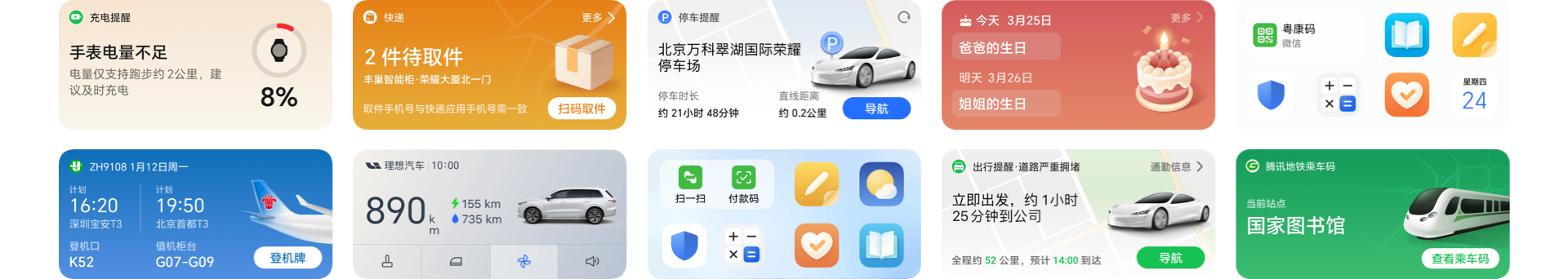 替您管理 地铁通勤、无忧打卡、健康码、付款码、惬意观影、快递提醒、充电提醒等多个场景。